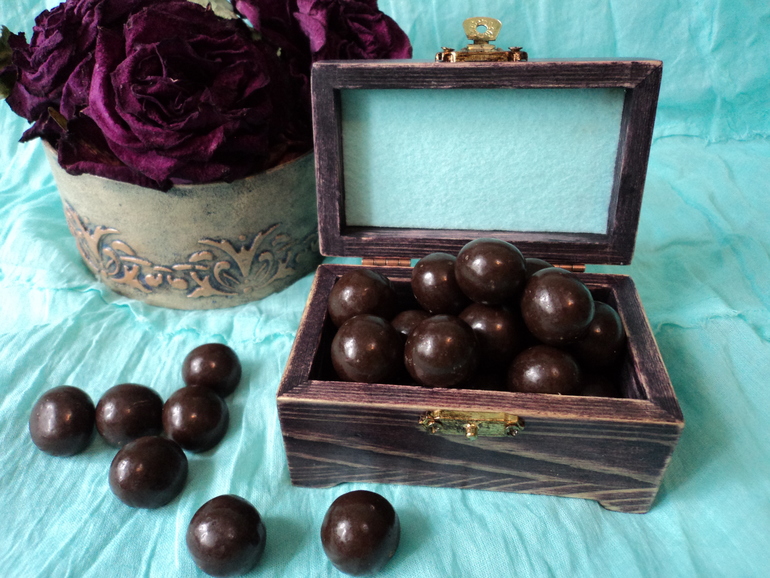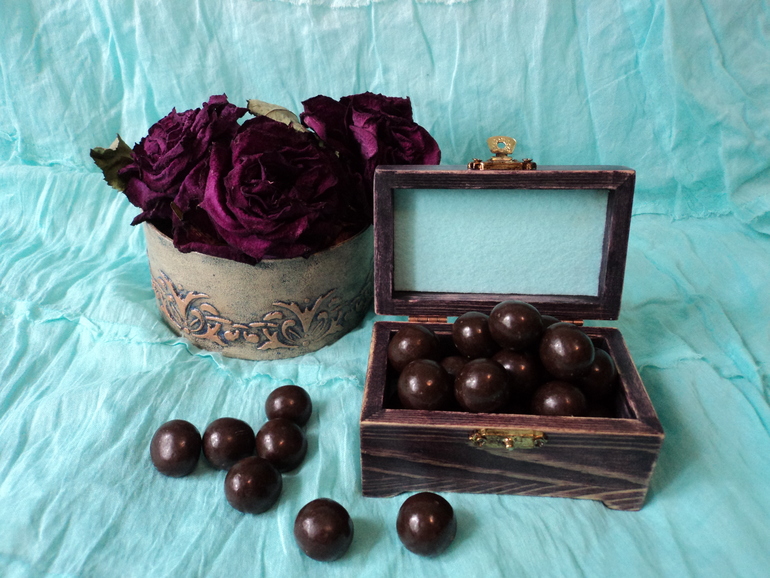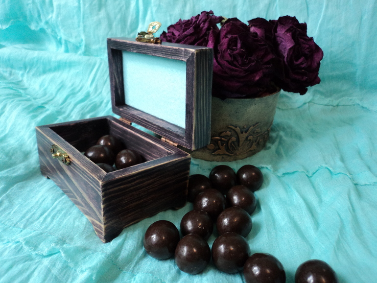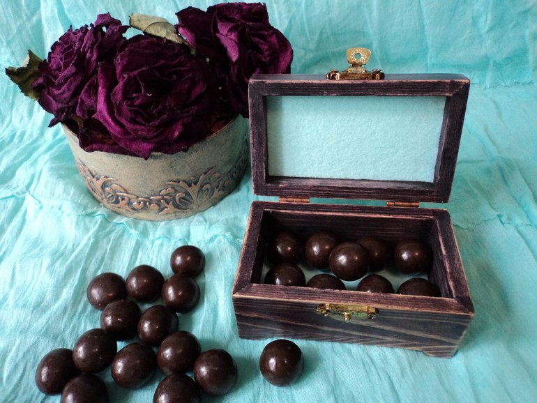 материалы: деревянная шкатулка, морилка "Эбеновое дерево", салфетка, клей ПВА, акриловые краски и лак, битум, флис, фундук в шоколаде))))))))