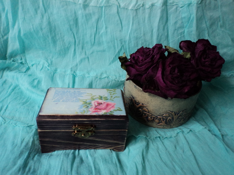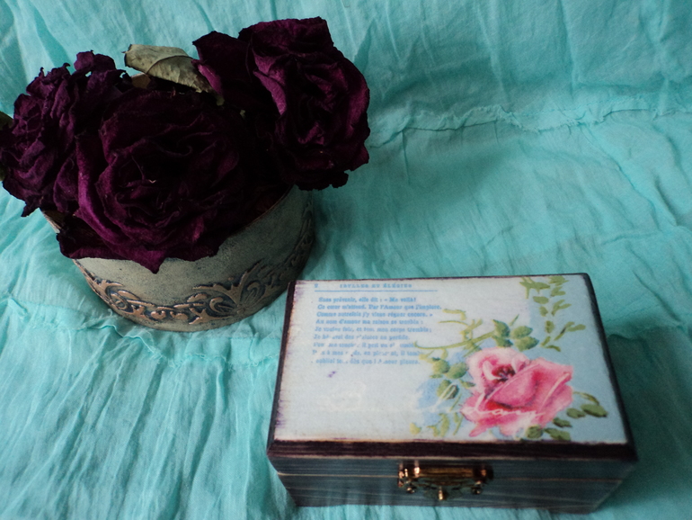 цвет морилки на дереве - темно-фиолетовый. Я потерла как следует, что фактуру дерева проявить. Сверху мотивчик подобрала с элегией на французском. Ну и, собственно, всё... решила белым сверху не брызгать и не старить больше ничем. Она мне и так понравилась)))) Отдаю на ваш суд.