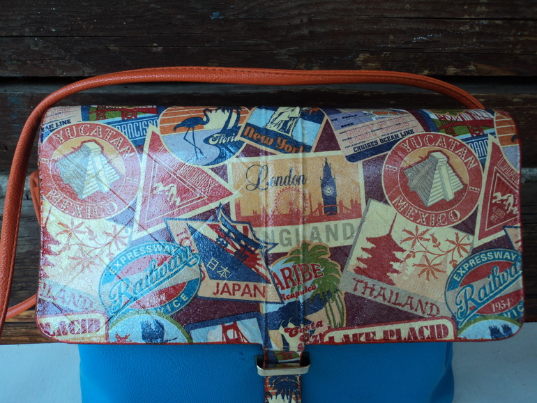 разноцветный клапан до декупажа был просто оранжевым и несколько потрепанным. Грунтовка, салфетка и стекловидный лак сделали свое дело - у сумочки новая жизнь)))