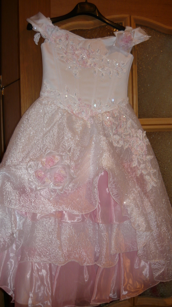 Продам платье.Одевали 3 раза на праздники.Куплено в "Принцессе Пипите".На наш ОГ 72 лиф уже маловат.Состояние хорошее.Требуется замена молнии.В подарок перчатки розового цвета.На рост приблизительно