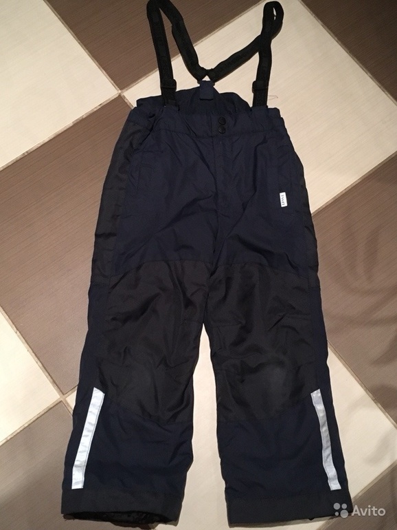 Зимние брюки фирмы ЛЭССИ, цвет синий с черным. р-р 116, лямки отстегиваются при желании, есть потертости на коленях Экв. 1000
