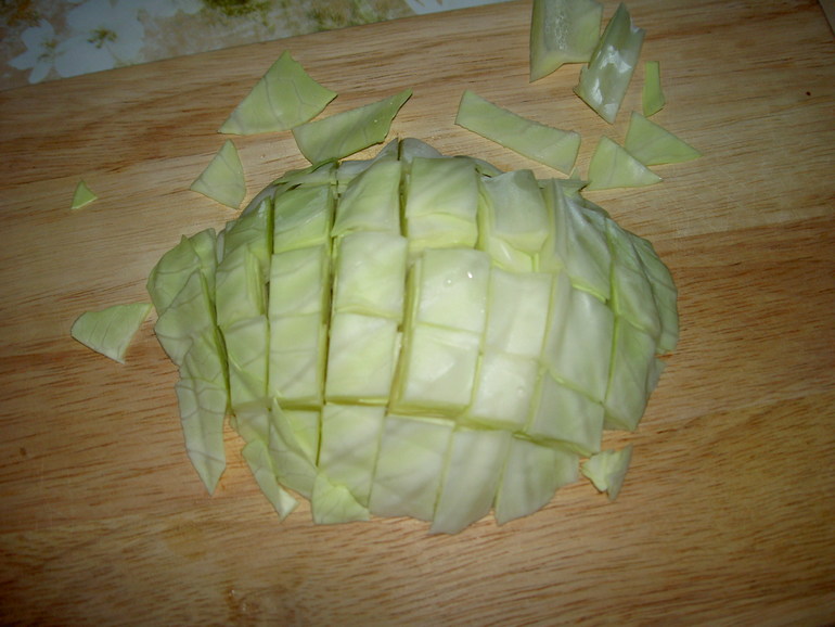 Капусту нарезать квадратами, залить холодной водой и поставить на огонь. Варить 15 минут после закипания.