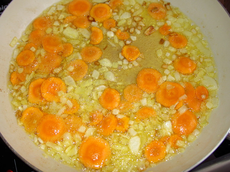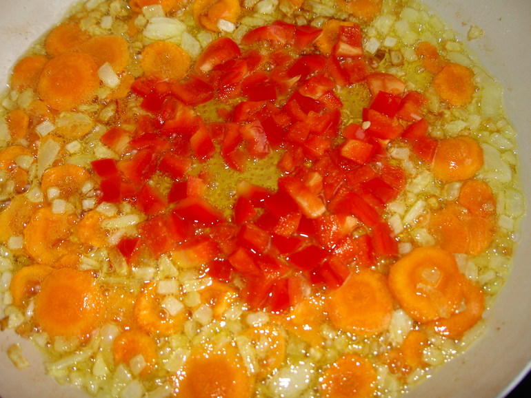 На сковороду с разогретым растительным маслом выложить лук и морковь. Обжаривать 10 минут. Затем сдвинуть овощи к краям, а в центр сковороды выложить болгарский перец и обжаривать, не смешивая, минуты 3.