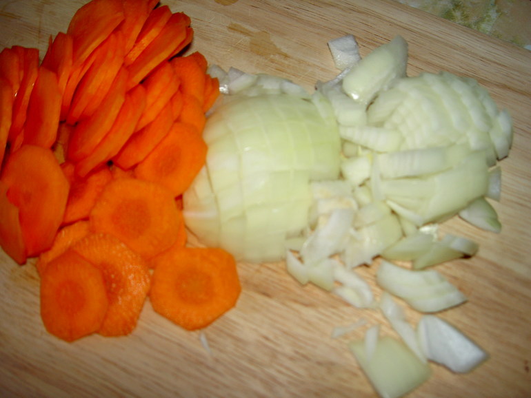 Пока картофель и капуста варятся, приготовим пассеровку. Для этого нарежем лук мелко, морковь - тонкими кружочками, болгарский перец - мелкими кубиками.