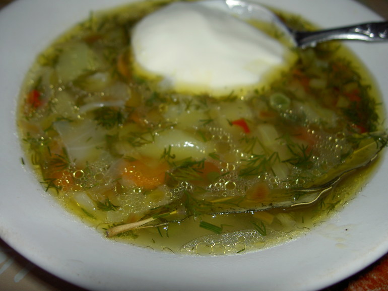 Добавить в суп пассеровку (если готовите с консервированным горошком, то добавьте и его), соль и перец, доводим до кипения, варим еще пару-тройку минут, снимаем с огня. Добавляем лавровый лист, мелко нарезанный укроп. Закрываем крышкой и даем супу настояться минут 30. Подавать со сметаной или без нее. Приятного аппетита!