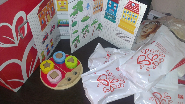 Итак, заполнили анкету и стали ждать посылку счастья!)) Она не разочаровала! В красивой красной коробочке с сердечками мы нашли чудесные подарочки: яркую красивую игрушку Божья коровка, набор для творчества "Сказочный город", наклейку для машины, журналы, скидочные купоны на приобретение игрушек фирмы в Детском мире и на Ozon, а также подарочки и скидки для друзей! И все это за честное мнение о продукции фирмы. А мнение, должна сказать, очень хорошее!)) Все игрушки очень оригинальные и интересные, изготовлены из экологически чистых материалов, детали приятны на ощупь. Миле Божья коровка очень понравилась. Сама вставляет колышки в соответствующее по форме углубление, колечки цветные тоже нанизывает, но пока через раз. Также можно с помощью этой игрушки изучать цвета и оттенки, чем мы планируем заняться в ближайшем будущем!