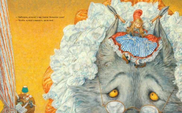 Так герои «Красной шапочки» становятся бродячими артистами, разыгрывающими перед нами свое представление. а действие «Принцессы на горошине» неожиданно разворачивается в Петергофе. Иллюстрации Ломаева - это настоящее пиршество для глаз, визуальное изобилие, почти барочная подробность в каждой детали. Но все это крепко сцеплено каркасом художественного вкуса автора, который еще ни разу не изменил ему." (с) Лабиринт