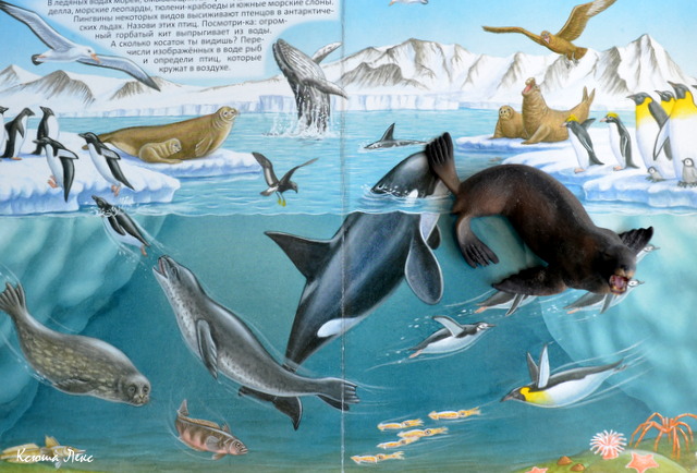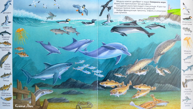 Это тоже, энциклопедия - гляделка, только с уклоном на изучение английского языка. Теме морских обитателей выделен 1 из разворотов. Информации не много, несколько предложений о кораллах и 7 слов, с переводом, которые нужно найти на картинке.