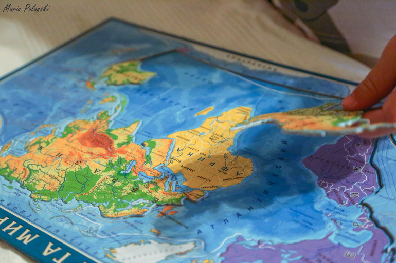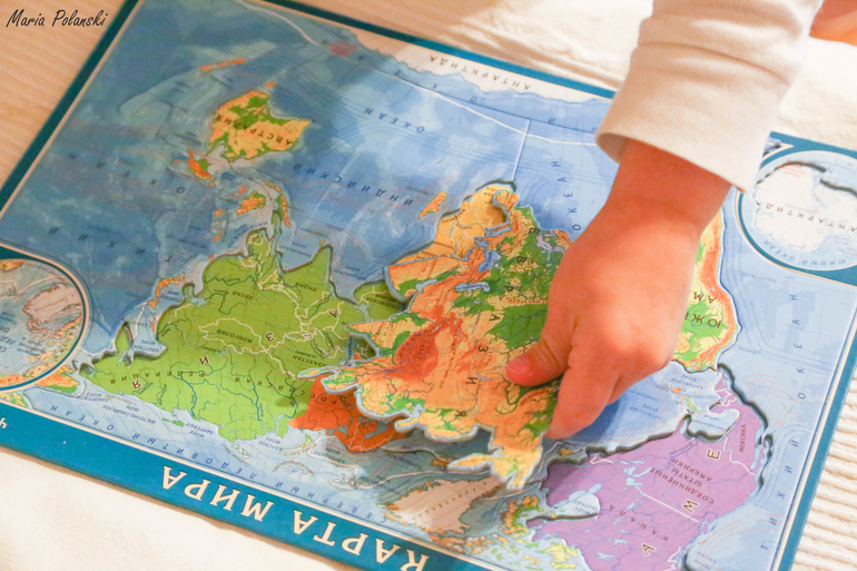 Итак, я расскажу о цветных морях на карте мира, о чудо-пазлах, которые идеально подходят для игрового изучения географии и о том, как мы перешли от материков и океанов к странам и конечно начали с России.