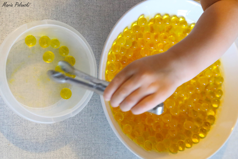 На следующий день он как следует напитался водой и его уже можно было использовать в играх на сенсорику и моторику - перенося пинцетом из общей миски в мисочку поменьше. И это оказалось не так уж и сложно! Сложнее было ловить прыгучие шарики, когда они разбегались))