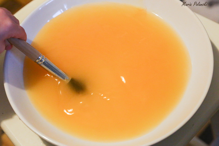 Впечатавшись мы тут же решили реализовать желтое море. Сначала у нас было задание на аккуратность и баланс, и Варя носила через всю кухню маленькие стаканчики с водой и наполняла "море" в тарелке. Первый блин был комом, она очень торопилась и пришлось все вытирать (самостоятельно разумеется), а потом уже носила аккуратнее. Затем покрасили воду гуашью.