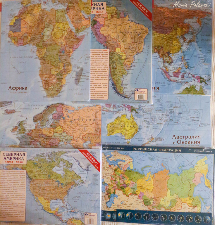 Недавно я совершенно случайно нашла пазлы, представляющие собой географические карты! Деталей не так уж и много, и они не обычные, а вырезанные по форме континентов и океанов, ну или стран и крупных частей стран (если говорить о российских субъектах). На мой взгляд это просто потрясающее пособие, которое позволяет ребенку в игровой форме познакомиться с географией и ненавязчиво запомнить названия и расположение основных крупных частей света и стран. И что очень приятно, пазлы из плотного, качественного картона, да еще и на подложке, на которой тоже напечатан рисунок (но немного другой по цвету, так что он не будет служить сильной подсказкой) и на ней же можно собирать детальки. Те, для кого это слишком просто могут собирать отдельно, на полу или на столе. Но моя Варя любит все пазлы собирать на подложках (обычных, без рисунков, просто с краями) и если их нет собирает с меньшим энтузиазмом. Несколько дней уже прошло с момента покупки этих пазлов и это просто хит у нас! Собираем с утра и до вечера))