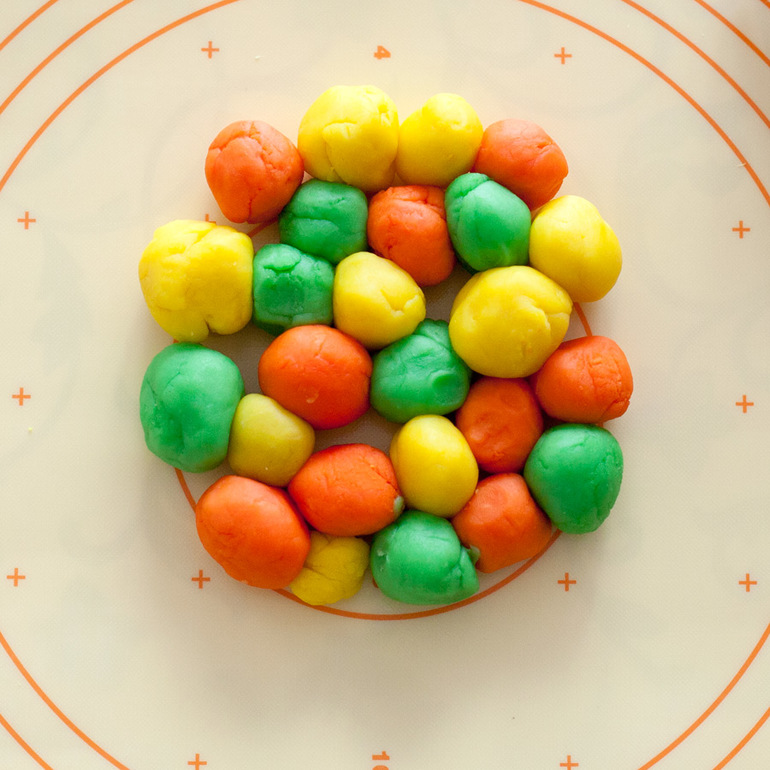 Для начала мы использовали половину каждого цвета, остальное я положила в холодильник. Мы накатали шариков из этих цветов и выложили их хаотично.