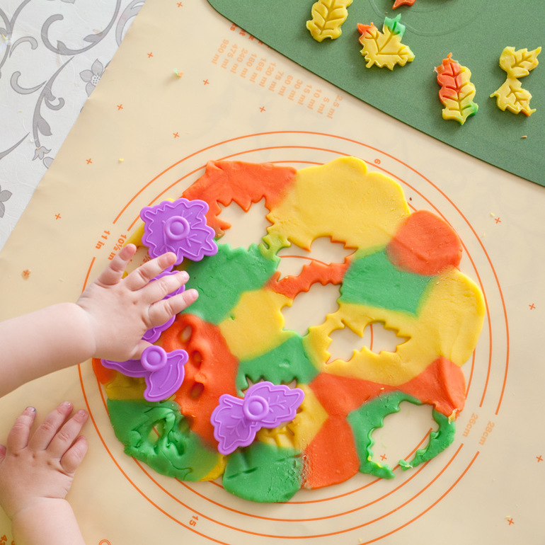 Затем раскатали скалкой круг и стали вырезать формочками листочки.