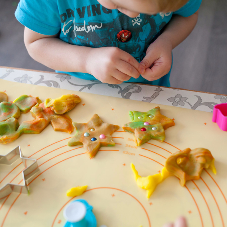 На днях думала о том, что нам нужно срочно новый рецепт теста для лепки, потому как тесто из крахмала мне нравится эстетически, но лепить из него неудобно. И вчера наткнулась на рецепт в блоге Ольги тут. Спасибо вам большое) И тут же его приготовила. Оно и правда хорошо тем, что пластичное, не липнет к рукам, мягкое, похоже на плэй до. И готовится довольно быстро. Я сделала 3 цвета.