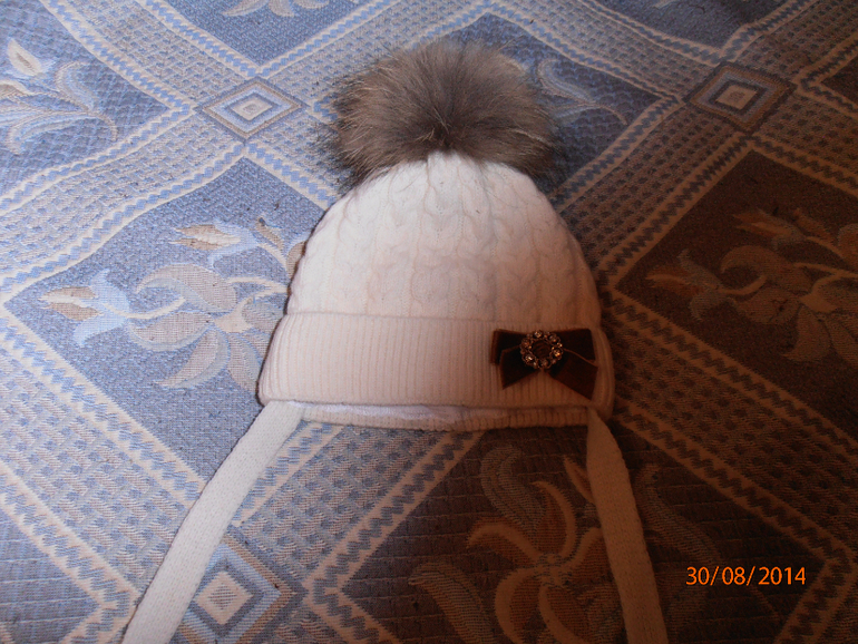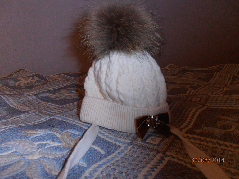 Очень красивая шапочка, 80 % шерсть, 20 % акрил, подклад хб, , на завязках, красивый пумпон из натурального меха (енот), состояние новой, маломерит, нам мала по высоте Продана