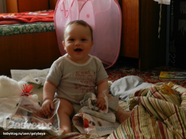 Но обо всем по порядку. Итак, мы отпразновали наше полугодовасие - приходили наши друзья, а я готовила чебуреки и торт "Три шоколада". С момента моего ухода в декрет я вообще стала поразительно много готовить. И до этого всегда старалась потчевать мужа домашней едой, но тут что-то совсем разошлась. И пеку пироги, и манты делаю, и чебуреки, а чизкейки с тирамису стали моим коронным блюдом (уже устала даже от них), даже вареники и пельмени сама леплю - сама в шоке! . Получили в подарок бодики и комбезики:) Довольная, как слон!!! Ах да, совсем забыла, наша московская бабушка передала нам очаровательный комплектик на лето (футболочка и шортики) и очередной комбез:) Так что мы готовы к солнечным дням!!! Еще бы погода была готова, но июнь в Приморье традиционно дождиво-туманный. Правда последние два дня солнышко радует наш край своим присутствием, но мы, к сожалению, не можем ему радоваться, однако об этом позже. Буквально через несколько дней после своего полугодовасия Мишутка пополз, прям как взрослый:) Причем случилось это очень неожиданно. Он давно довольно шустро передвигался по комнате, но не использовал свои ручки в полном объеме, т.е. он вставал на четвереньки, подтягивал до максимума коленки к ручкам и прыгал. Такой вид передвижения напоминает гусеничку. И ровно через полторы недели после первого юбилея - 29 мая -мелочь догадался переставлять ручки, сначала только левую, а в течение пары дней дошел и до правой. Так что теперь мы ловко ползаем! И главное очень быстро. У него абсолютно не было страха перед "выползом" из комнаты. Более того, даже если он чем-то очень увлечен и я быстренько бегу куда-нибудь, чтобы что-то успеть сделать, буквально через минутку я слышу "топ-топ" ручками по полу и вот он:) здрасте:) выползает из-за угла:) И улыбается маме:) Такая лапа:):):) Мало того он упорно пытается встать, точнее стоит он уже довольно уверенно, но хочет прям отпуститься и пойти. А этого у него не получается и мы падаем, немножко плачем, если мамины руки не успели подхватить и начинаем заново... В поледний день весны - 31 мая - в нашем очаровательном ротике я обнаружила сразу два зубика. О-хо-хо, как уж мы их ждали. С трех месяцев вытирали слюни, мазали десна, укачивали ночью на все лады и давали грызть все. И наконец-то они появились... думала немножко одтохнем, но радость моя была недолгой, вслед за ними сразу начали прорезываться еще 3 - два верхних резца и нижний левый. Кстати он-то и вылез третьим. т.е. у нас порядок вылазки зубиков нарушен. Вылез он 19 июня. А сегодня проклюнулся верхний левый. Второй пока сильно набух и уже видна белая полоска. Если они будут лезть в таком темпе.... уф, я прям не могу уже... Мы очень капризно переносим появление зубиков, скандалим на все, хныкаем, все время желаем быть на ручках. В общем просто беда. Но мы это переживем, я знаю точно.