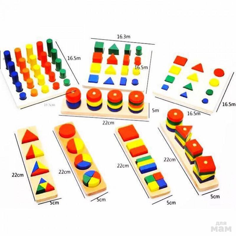 Комплект направлен на сенсорное восприятие. Ребенок запоминает названия фигур и цветов, учится счету до 4. Развивается наблюдательность, внимание, умение анализировать.