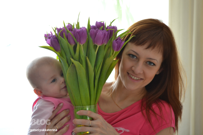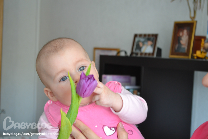 Утром же 8-го марта Даша сама перевернулась в кроватке со спинки на животик! Она последнее время полюбила там валяться, смеется, вижжит, с подушкой борется))) И вот вообщем как-то в борьбе с подушкой, перевернулась. правда еще не полностью, ручку из под живота достать не может, но все равно, начало положено!