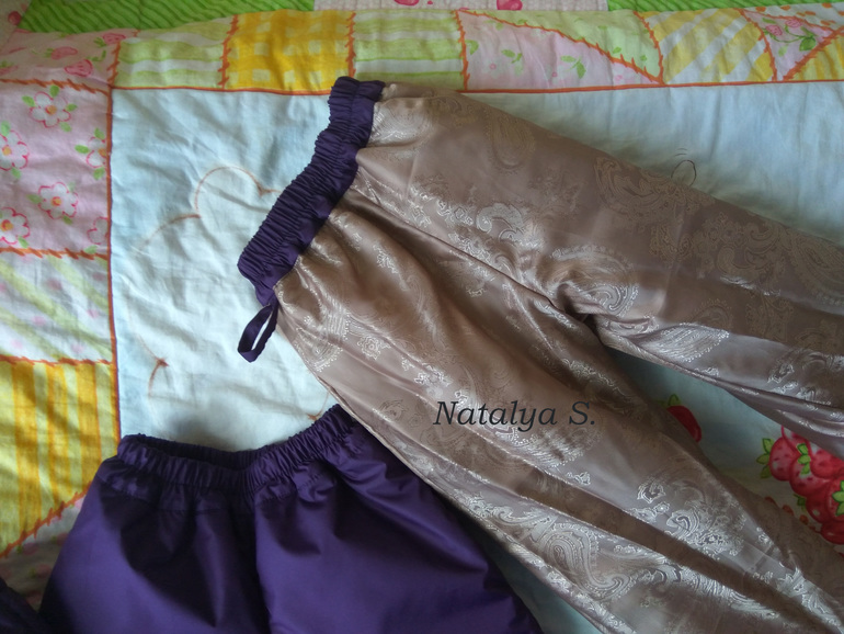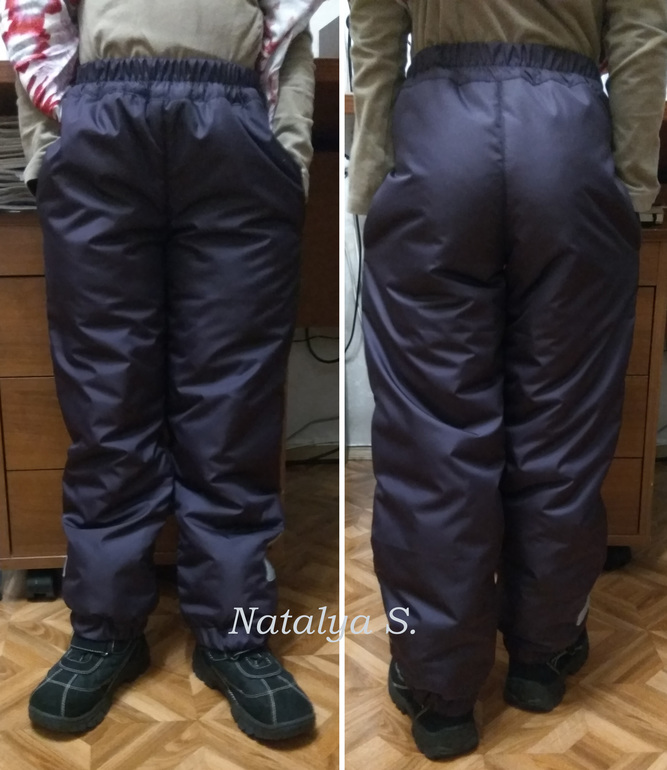 Метод сборки: соединила плащевку с утеплителем, собрала по центральным швам, потом шаговый, вшила карманы, сшила боковые швы, настрочила СВО ленту (вспомнила про СВО АПАсля, поэтому немного неудобно пришивать получилось). Далее собрала подклад, соединила бутерброд - внизу штанины и по поясу, пришила пояс (добавив петельку), вставила резинки и закрепила их (по поясу прострочила вдоль посередине, на штанинах просто короткими строчками вдоль бокового шва). ОТСТРЕЛЯЛАСЬ! ФУХ.