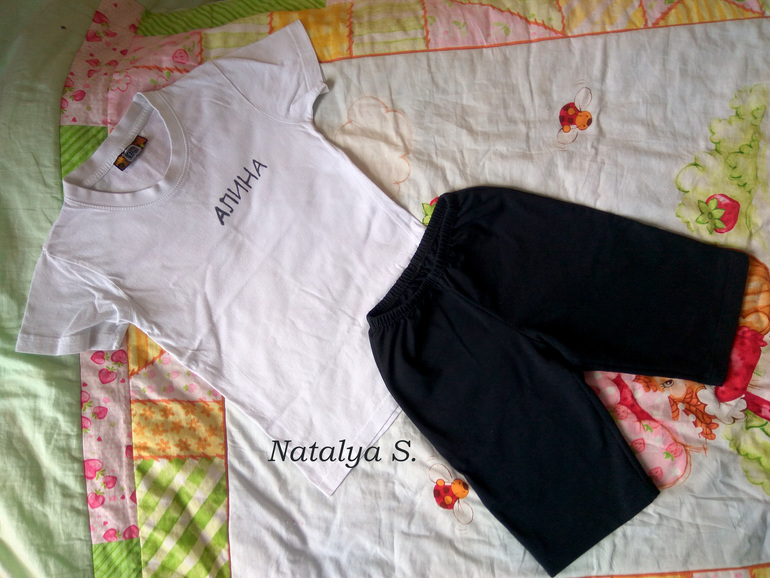 Вот весь комплект, имя на футболке написали маркером для ткани: