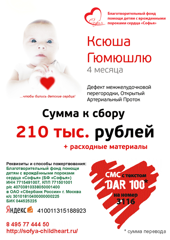 БлаготворительностьКсюше нужна операция на открытом сердце с использованием аппарата искусственного кровообращения. Стоимость операции указана в счете. Дополнительно нужны будут расходные материалы, на которые ждем счет.![]()