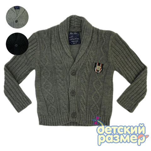 Кофта на мальчика: модный дизайн; спереди и на рукавах крупная вязка; на пуговицах; украшена стильной эмблемой