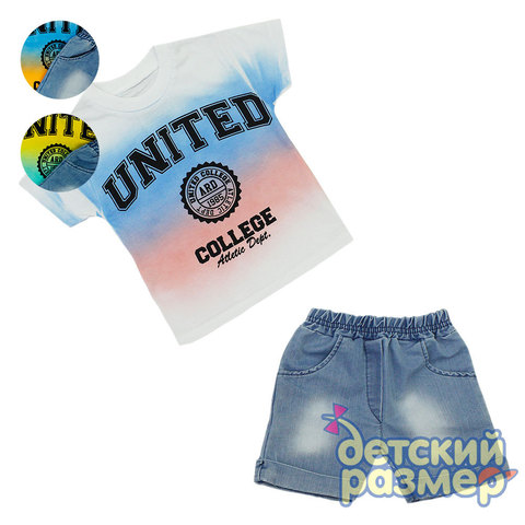 Летний костюм для малышей: стильная футболка с интересной расцветкой и принтом "надпись"; джинсовые шорты на удобной резинке, штанины с отворотами