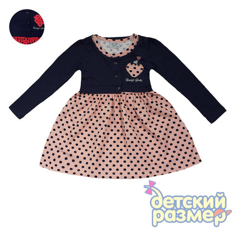 Платье для девочек: контрастная расцветка; юбка в мелкий горошек; спереди аппликация "кошка" и декоративный бантик