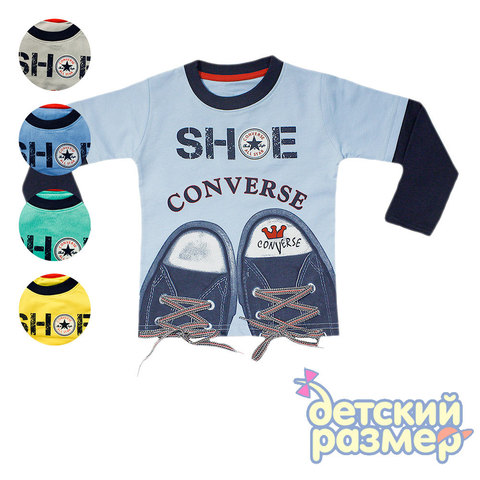 Футболка с имитацией двойного слоя и рисунком "кеды". Длинный рукав, настоящая шнуровка и несколько цветов на выбор: синий, зеленый, серый и голубой.