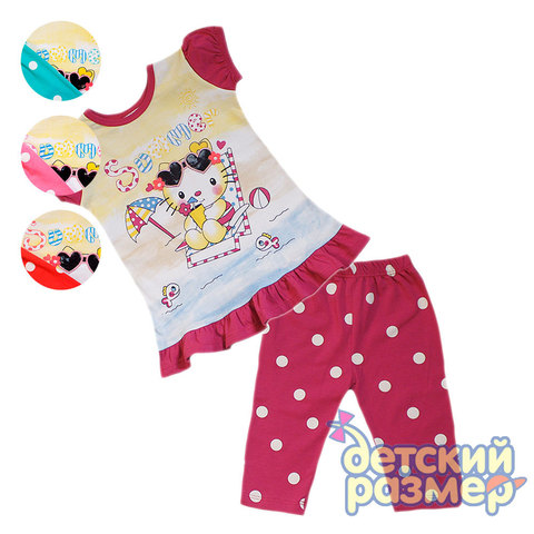 (Трикотажный костюм для девочки: туника с милым принтом, украшена декоративной аппликацией. по низу идет волнистая окантовка, велосипедки в цветочек, с удобным поясом на резинке)