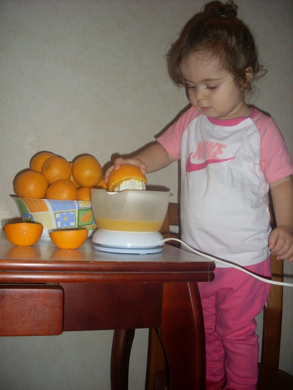 далее идет вкусный и ароматный процесс, с Эвой выжимаем сок из апельсинов. Эва не только сок очень любит, но и этот процесс, потому принимает самое активное участие в нем
