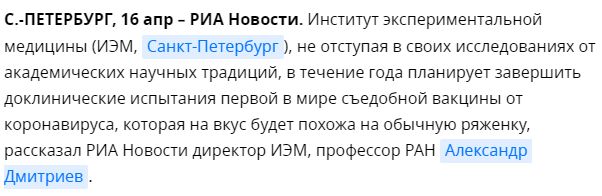 О, как. В Питере идет разработка вакцины от короны , в виде йогурта