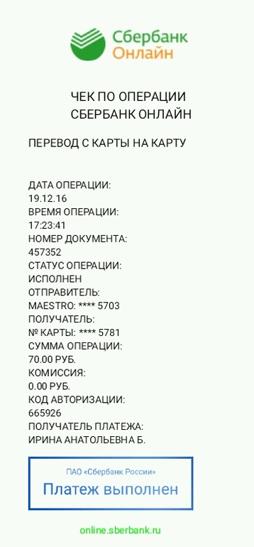 Сбербанк Б. Ирина Анатольевна 4276 8381 9196 5781