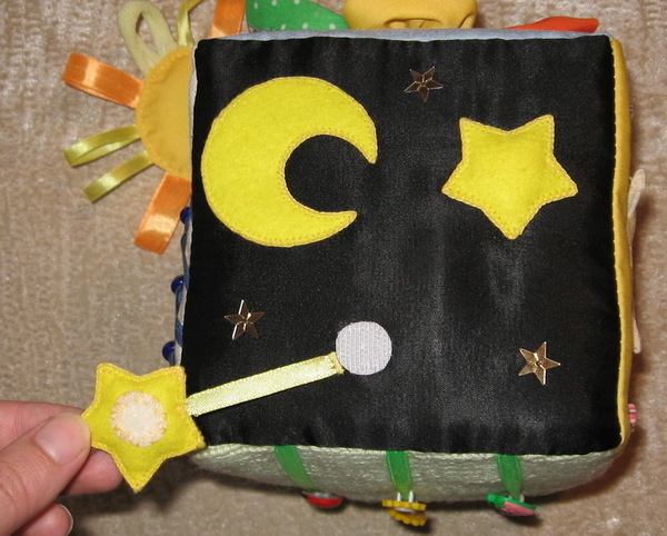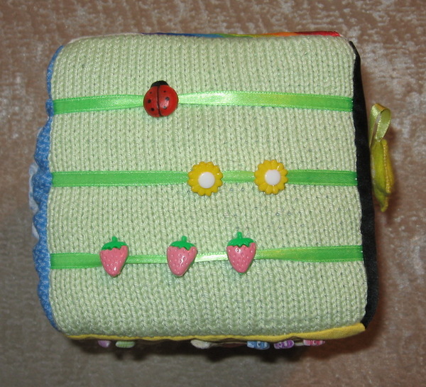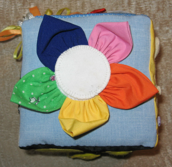 1 сторона. Цветок с разноцветными лепестками, Лепестки складывала из МК канзаши. Синий лепесток шуршит, в оранжевом - пуговицы, в желтом - пульки. Серединка закрывается на кнопочку.