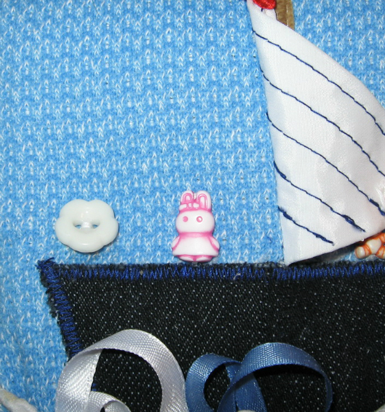 5 сторона. Кораблик с пассажирами и карманом-"волной", в котором прячутся: "жемчужина", пуговка-черепашка, спил ракушки.
