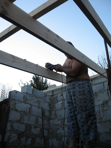 Пыряли - муж строит обрешетку для крыши из поликарбоната. Стену из блоков тоже сам ложил/клал - хз как правильно.