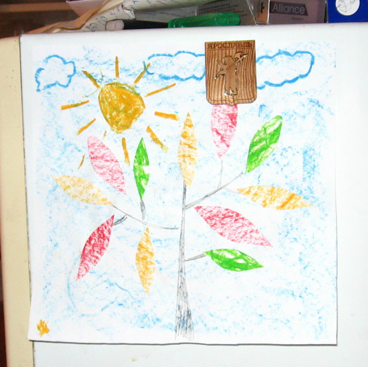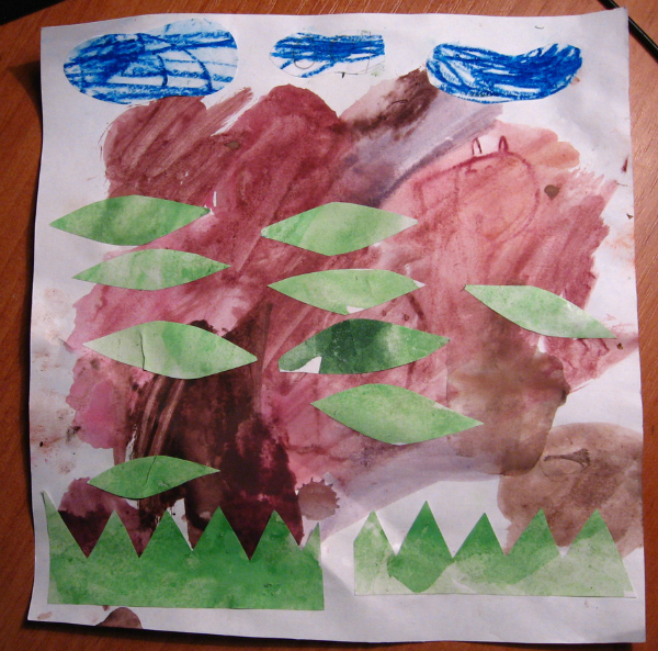 Красила бумагу восковыми мелками Аня, само солнце Аня нарисовала и листики клеила. Все остальное - ну там резать, ствол нарисовать - я.