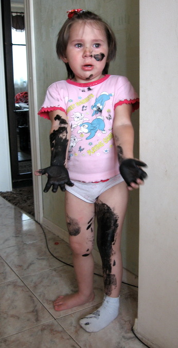 Ну что - барышня весьма самостоятельна, пока я чистила картошку и кромсала ее в кастрУлю, моё чудо-чадо стало шахтером.