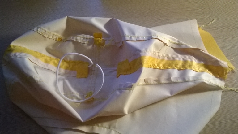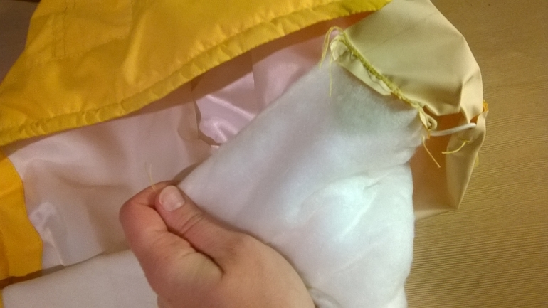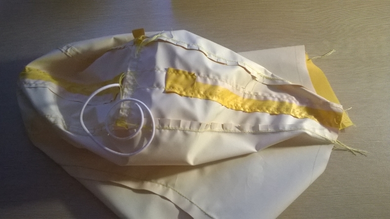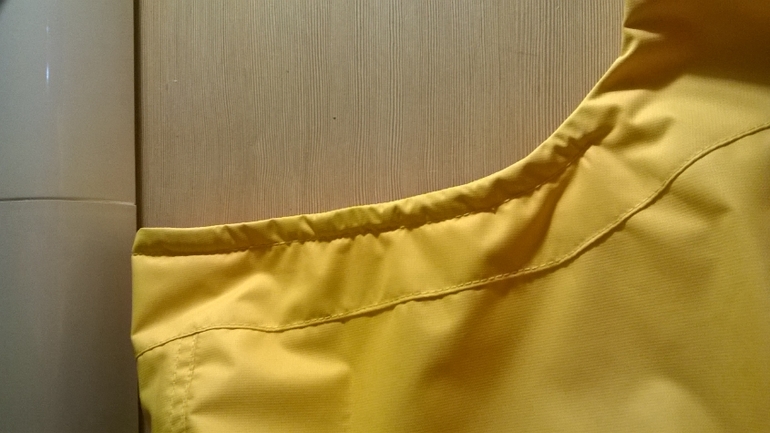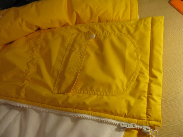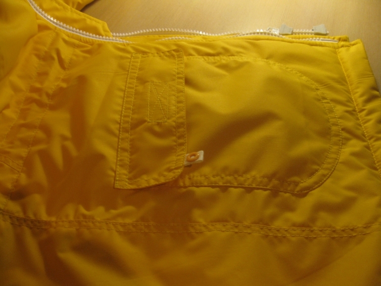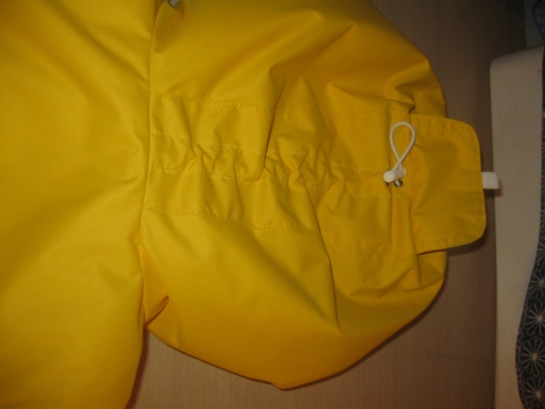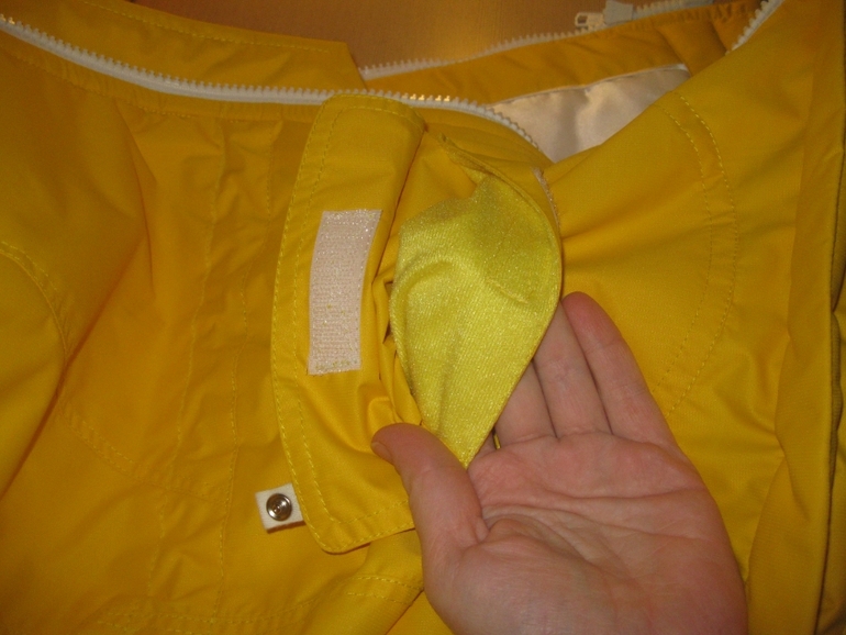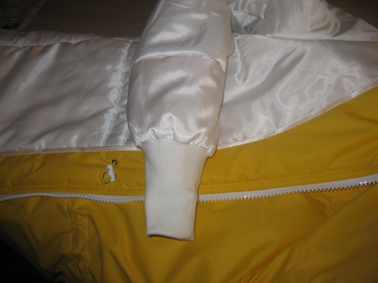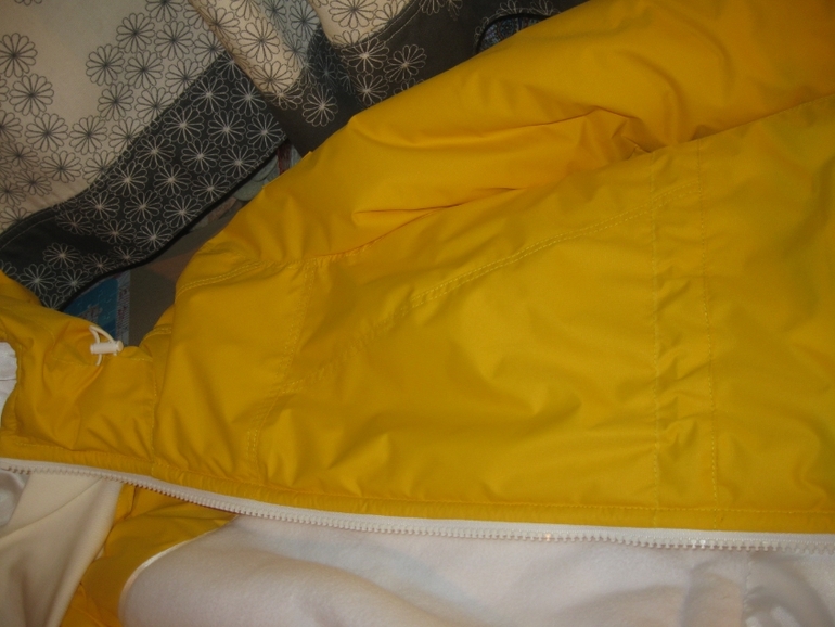мембрана желтая плотная, альполюкс 200, подклад вискоза белая, приятная скользкая, флис частично на спинке, молния двухсторонняя белая, лента велкло, резинка плотная желтая и белая, люверсы для утяжки капа по глубине и регулирования талии, каризма желтая на карманах, кнопки и киперная лента для отделки