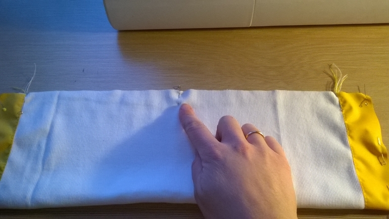 приступаю к соединению с длинной частью по краю. ВСЕГДА МАЛЕНЬКУЮ ДЕТАЛЬ НАКЛАДЫВАЮТ НА БОЛЬШУЮ, ТОЛЬКО ТАК СТАЧИВАЮТ. Запомните это правило и строчки будут ровнее. + к этому четкие прибавки )))
