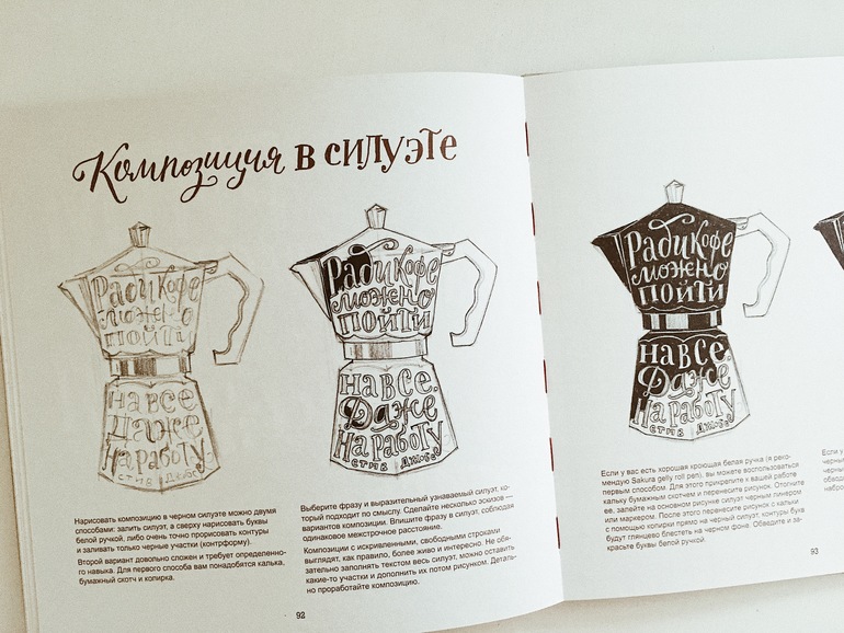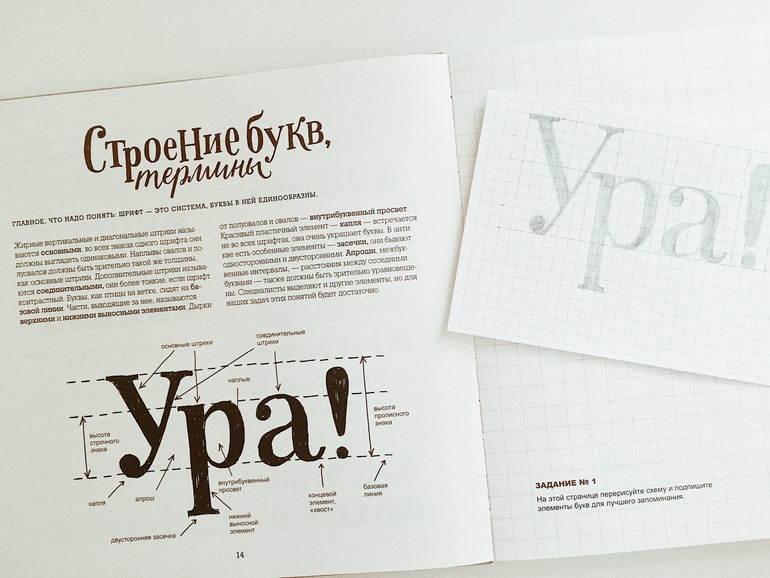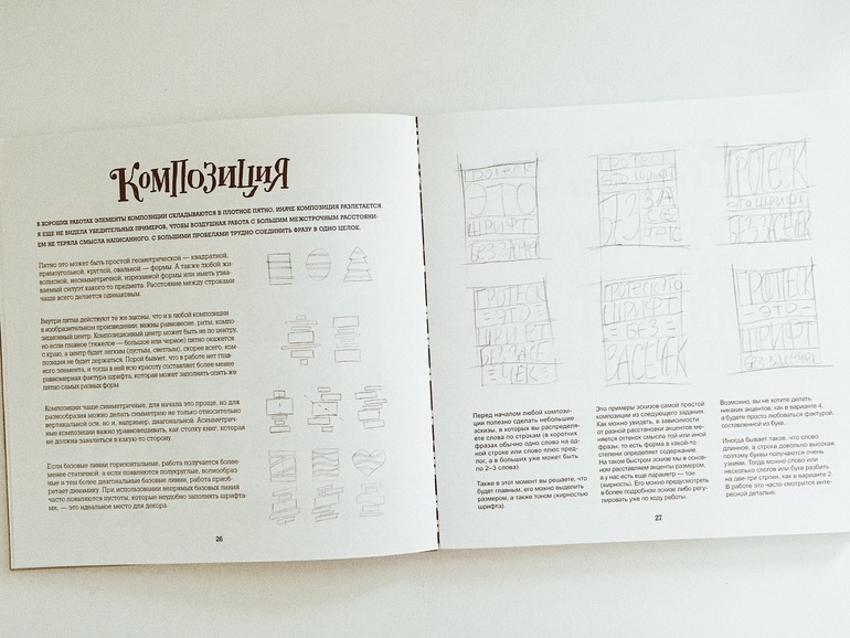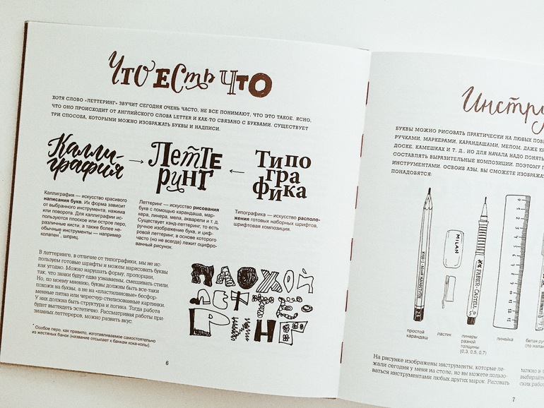 Благодаря этой книге я узнала, в чем разница между каллиграфией и леттерингом. Раньше я думала, что это одно и то же. А теперь поняла, что мне как раз леттеринг и нужно изучать, а вовсе не каллиграфию. Я познакомилась с историей шрифта, разными видами шрифтов, строением букв, а также, научилась основным правилам рисования букв. Да, да, не написания, а именно рисования!