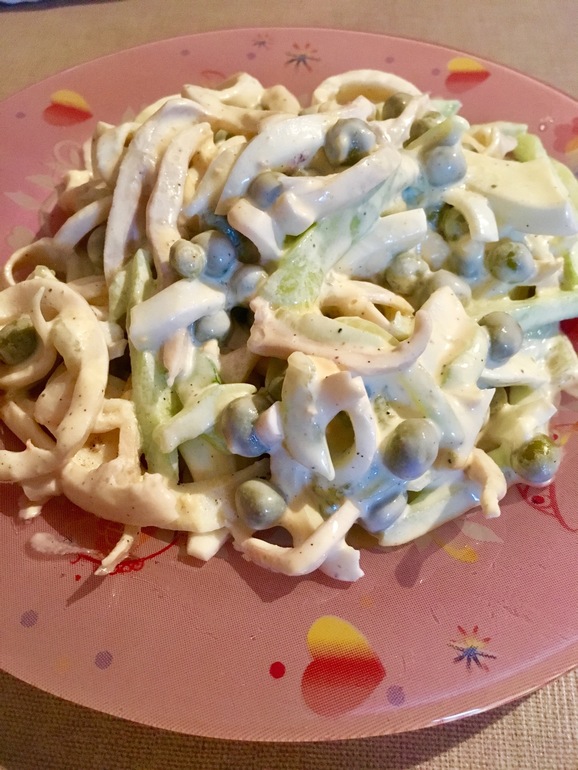 Кальмары 4 тушки,чистим,отвариваем -воспользовалась здешним советом -очищенные кальмары кладём на минуту в кипящую воду с долькой лимона и солью,выключить и оставить остывать -кальмары получились