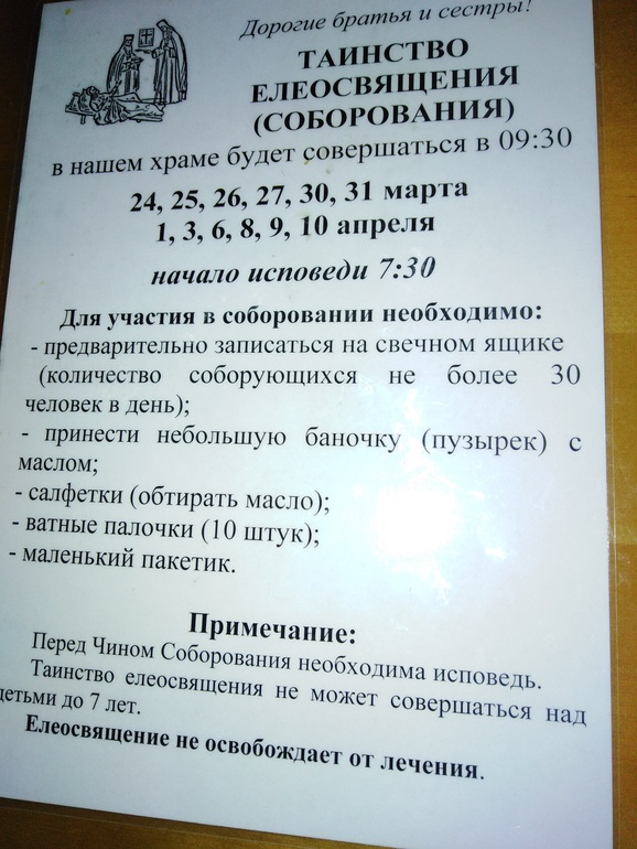 Ничего себе у вас там народу в Храме. А у нас разделили Соборование. Я не знаю пойду или нет пока.