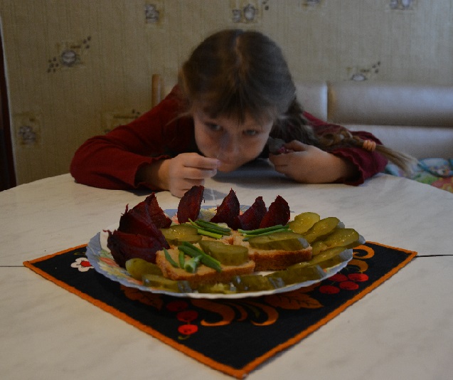 Бутерброды, нарезанный огурец и свёклу сервируем на блюде, если успеваем, пока голодные домочадцы не растащили.