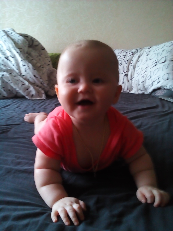 2 недели назад она начала понемногу ползать по пластунски. На четвереньки пытается встать,но ногу одну так и не соображает достать и садиться обратно. Или на пузико брякается. Зубов нет. Ели бы все,но аллергия. На белки молока и сладкое. Сейчас она уже хорошо по пластунски ползает по кровати. Вчера встала у бортика кроватки,но я чуть помогла.