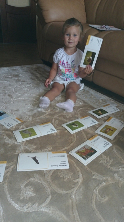 Помимо общего развития, еще и английским занимаемся. Начала с сына, но со мной ему скучно, хочет продолжать заниматься в РЦ "Сема". А вот доче не скучно. Занимаемся по карточкам серии "Умница". Там есть все для занятий, карточки, диск с песнями, сценарий. Но я еще стараюсь дополнять мультами, книгами. Вот одно из занятий.
