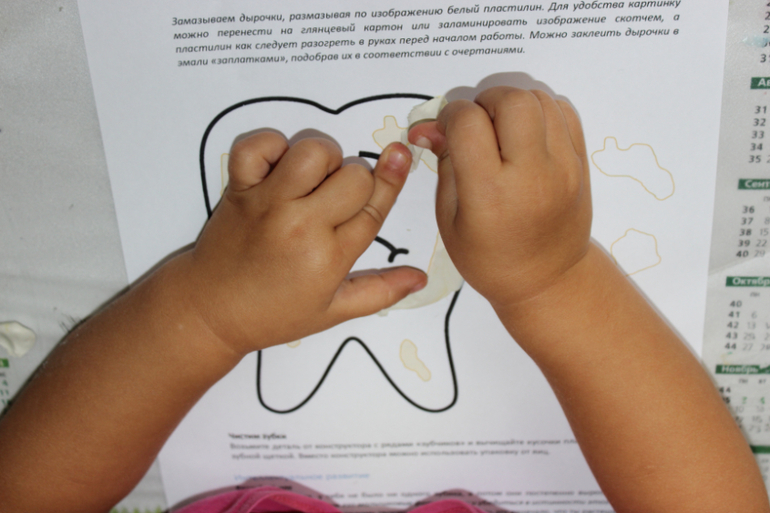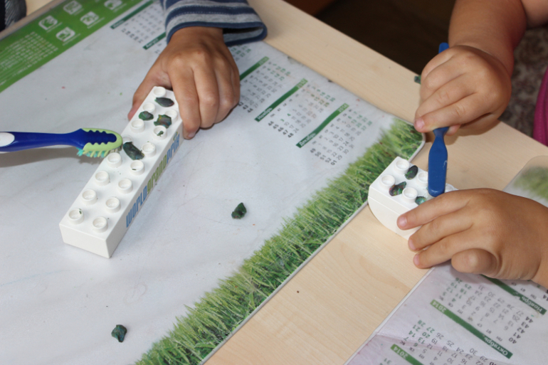 Возьмите деталь от конструктора с рядами «зубчиков» и вычищайте кусочки пластилина обычной зубной щеткой. Вместо конструктора можно использовать упаковку от яиц.
