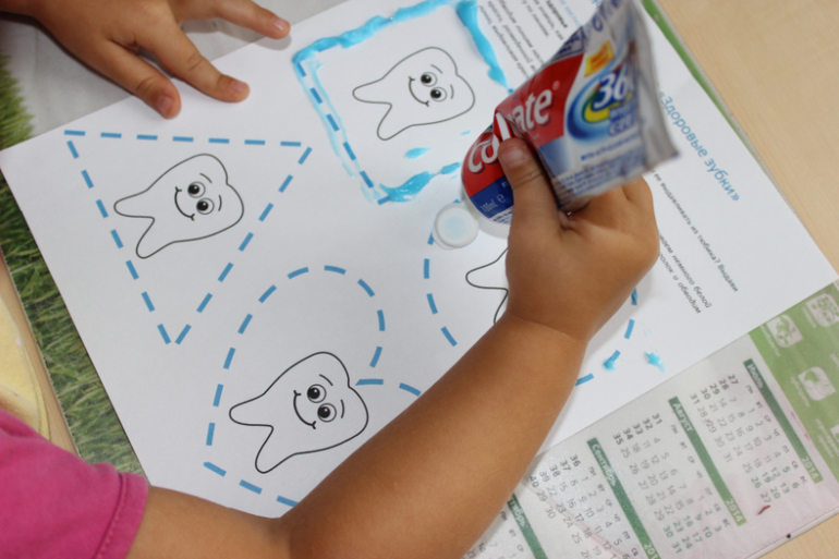 Подитожить занятие смешной игрой. Попросите малыша помочь вам записать правила ухода за зубами.