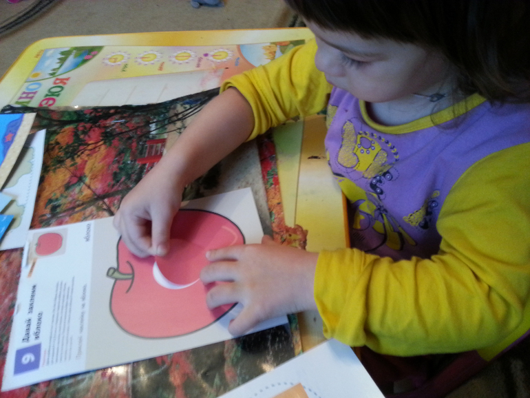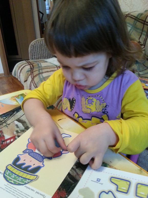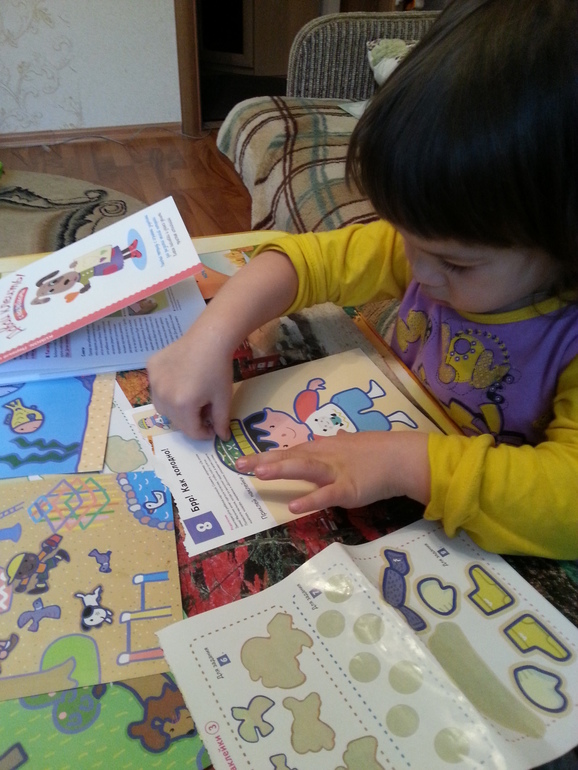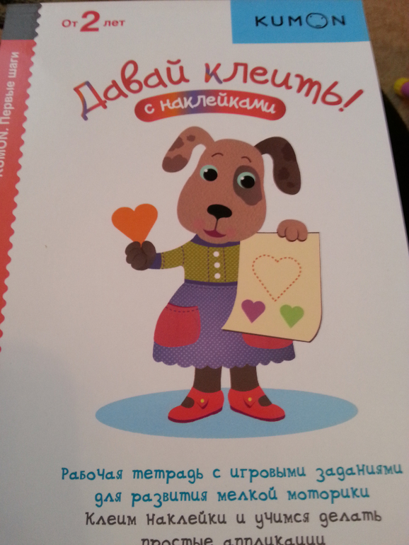"Давай клеить" Kumon-впервые купила,очень рада,единственный минус,все-таки формат маловат,была уверена ,что А4..оказалось А5..ребенку нравится клеить,половину книги уже исползовали!СУпер!вот фото!